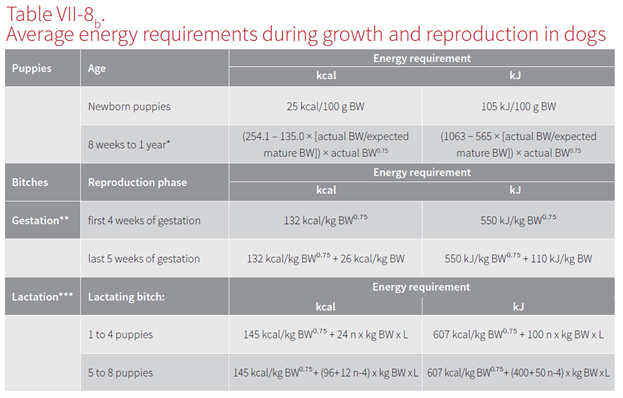 表Ⅶ-8b 犬類在生長和繁殖期間的平均能量需求量
